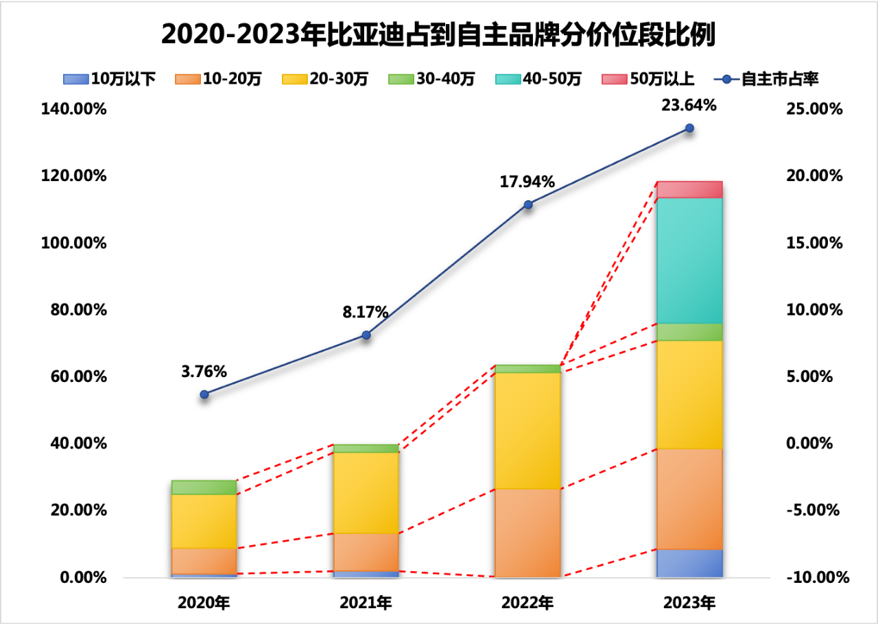 如果我们回到自主品牌的视角里看,比亚迪更是在三个价位段的市占率超过30%:在40-50万价位段的份额为37.55%,在20-30万价位段的份额为32.36%,在10-20万价位段为30.02%。这样的销量表现也证明了——2023年比亚迪的高端不仅仅实现了突破,而且非常成功,如果非要挑一点不足的话,那就是在30-40这个价位段只有量变还没有实现质变,当然随着2024年方程豹和腾势两个品牌的全新产品投入市场,将会进一步带动覆盖面更广、更加全面的高端化。