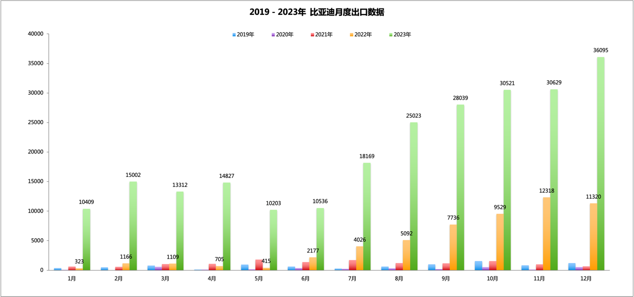 2023年也是比亚迪乘用车全面出海的第一年,这一年比亚迪进入了全球58个国家和地区,实现了242,765辆的出口,同比增长3.34倍。