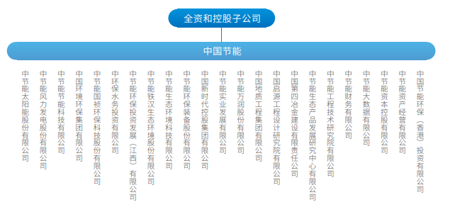 中国节能拥有下属企业700余家,6家上市公司,业务分布在国内各省市及境外约110个国家和地区,形成了“3+3+1”的产业格局(专注节能与清洁供能、生态环保、生命健康三大主业,加快发展绿色建筑、绿色新材料、绿色工程服务三大业务,铸强战略支持能力),是我国节能环保领域规模大、专业全、业务覆盖面广、综合实力强的旗舰企业。