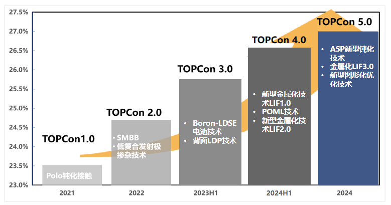 徐伟智透露,完成TOPCon 4.0的迭代升级后,TOPCon 5.0也在持续进行中。至2024年内,TOPCon电池的中试线量产平均效率有望达27%,最高效率达27.3%-27.4%;至2025年内,TOPCon电池的中试线量产平均效率有望达27.5%,最高效率达27.8%-28%。