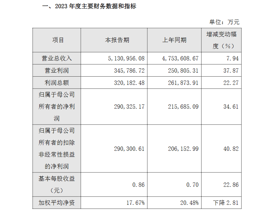 报告期内,公司实现营业收入513.10亿元,较上年同期增长7.94%;营业利润34.58亿元,较上年同期增长37.87%;利润总额32.02亿元,较上年同期增长22.27%;实现归属于母公司所有者的净利润29.03亿元,较上年同期增长34.61%;扣非后归母净利润29.03亿元,较上年同期增长40.82%;基本每股收益0.86元,较上年同期增长22.86%。