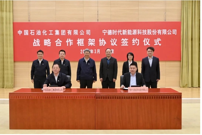 3月13日,中国石化集团与宁德时代新能源科技股份有限公司在北京签署战略合作框架协议。中国石化集团公司董事长、党组书记马永生先生,宁德时代董事长、总经理曾毓群先生一行见证签约。中国石化集团公司党组成员、副总经理吕亮功与宁德时代市场体系联席总裁谭立斌代表双方签署协议。