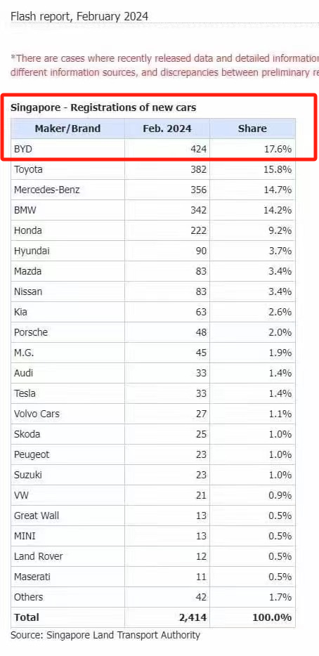 近日,新加坡汽车销售数据曝光!2024年2月,比亚迪在新加坡卖出424辆汽车,占总汽车销售份额的17.6%!