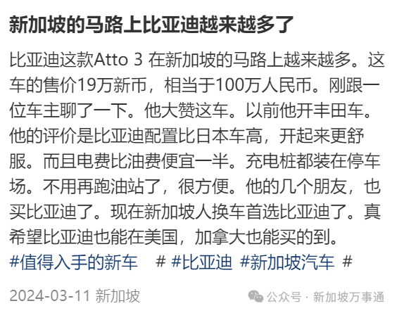如今在新加坡销量最好,更多人开的是——比亚迪!