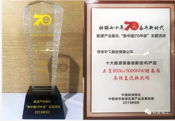 又讯:9月19日,以“壮丽七十年·奋斗新时代”为主题的“第三届(2019)中国能源产业发展年会暨首届能源文化节”在北京隆重举行。作为能源产业向“新中国70华诞”的献礼,年会对能源行业70年来,为能源产业蓬勃发展做出巨大贡献的能源人物和单位进行了表彰。本次年会上,特变电工董事长张新以在推动我国能源产业转型做出的突出成就,获得“能源功勋·新时代十大领军民营企业家”殊荣,特变电工“正负800kv/5000MW特高压柔性直流换流阀”荣获新时代·能源行业“十大能源装备创新技术/产品”奖项。