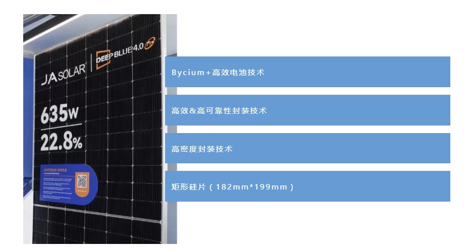 紧跟市场对高效n型产品这一需求,2023年晶澳科技推出DeepBlue 4.0 Pro系列产品,通过采用Bycium+高效电池技术、高效&高可靠性封装技术、高密度封装技术以及矩形硅片(182mm*199mm)等四大核心技术,可以分别满足不同客户在大型地面电站、工商业及户用屋顶等分布式项目的应用。