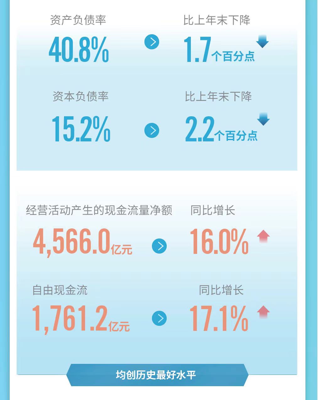 中国石油方面还表示,2023年公司资产负债结构进一步优化,财务状况持续稳健。资产负债率40.8%,比上年末下降1.7个百分点,为近13年来最低;资本负债率15.2%,比上年末下降2.2个百分点,为近15年来最低。经营活动产生的现金流量净额4566.0亿元,同比增长16.0%;自由现金流1761.2亿元,同比增长17.1%,均创历史同期最好水平。