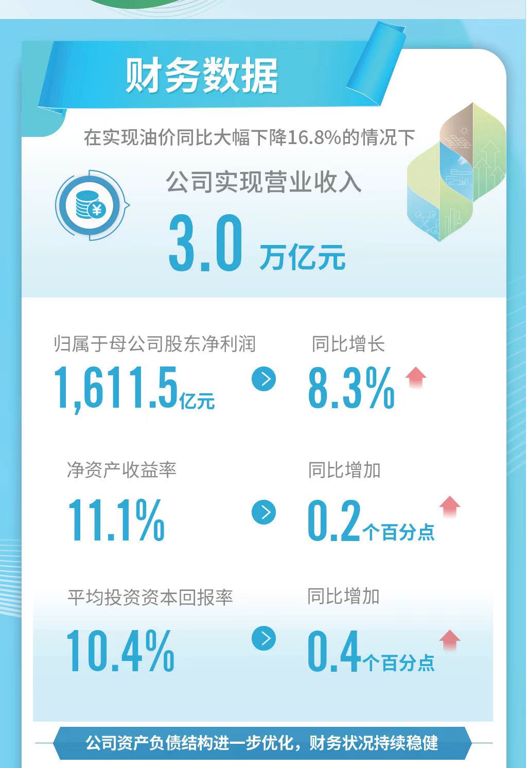 按照国际财务报告准则,2023年中国石油实现营业收入3.0万亿元(人民币,下同);归属于母公司股东净利润1611.5亿元,同比增长8.3%,净资产收益率11.1%,平均投资资本回报率10.4%。