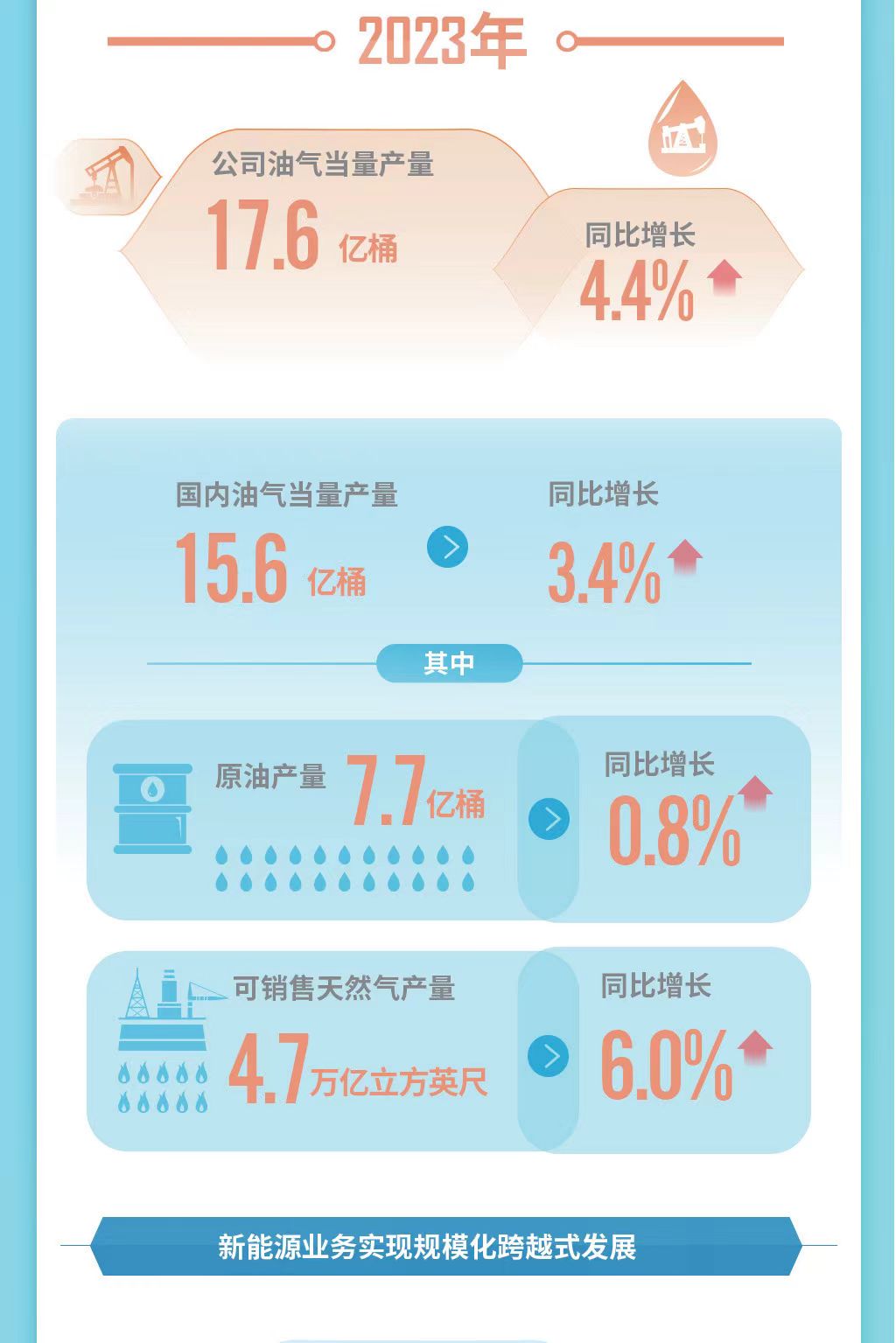 2023年,中国石油油气当量产量再创新高。公司持续推进高效勘探,努力提升经济可采储量,在鄂尔多斯、塔里木、四川、渤海湾等重点盆地取得一批重大突破和重要发现。强化老油气田稳产和新区效益建产,原油产量保持稳中有增,天然气产量继续较快增长,占油气当量的比例持续提升。海外业务保持稳健发展,资产质量不断优化,国际化运营水平持续提升。2023年,油气当量产量实现17.6亿桶,同比增长4.4%;国内油气当量产量15.6亿桶,同比增长3.4%,其中原油产量7.7亿桶,同比增长0.8%;可销售天然气产量4.7万亿立方英尺,同比增长6.0%。