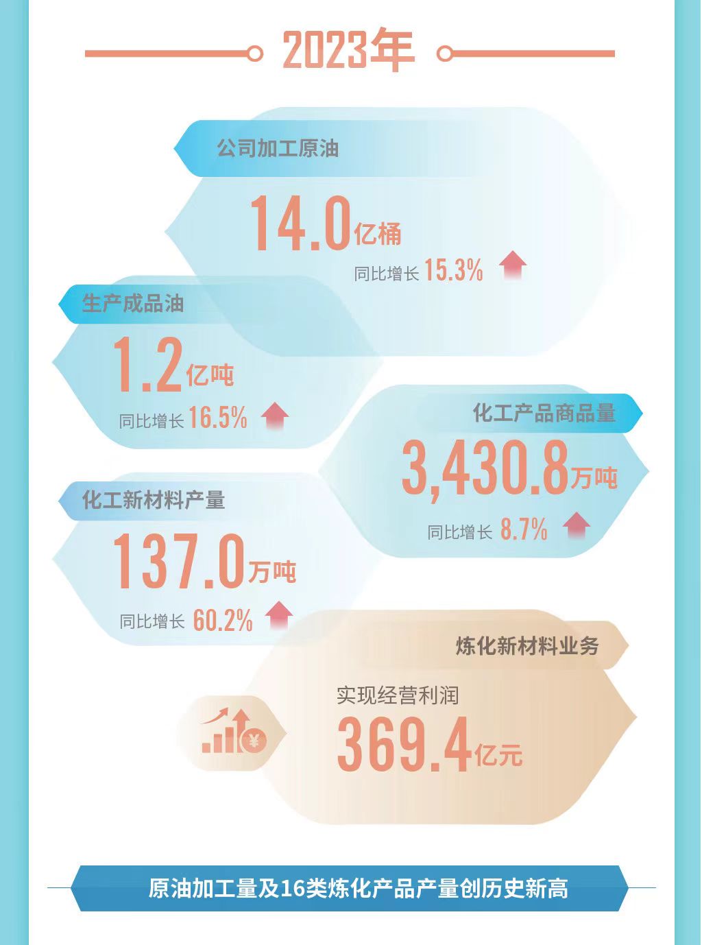 炼化业务方面,中国石油转型升级深入推进,向产业链和价值链中高端迈进。2023年,公司加工原油14.0亿桶,同比增长15.3%;生产成品油1.2亿吨,同比增长16.5%;化工产品商品量3430.8万吨,同比增长8.7%;化工新材料产量137.0万吨,同比增长60%。炼化新材料业务实现经营利润369.4亿元。