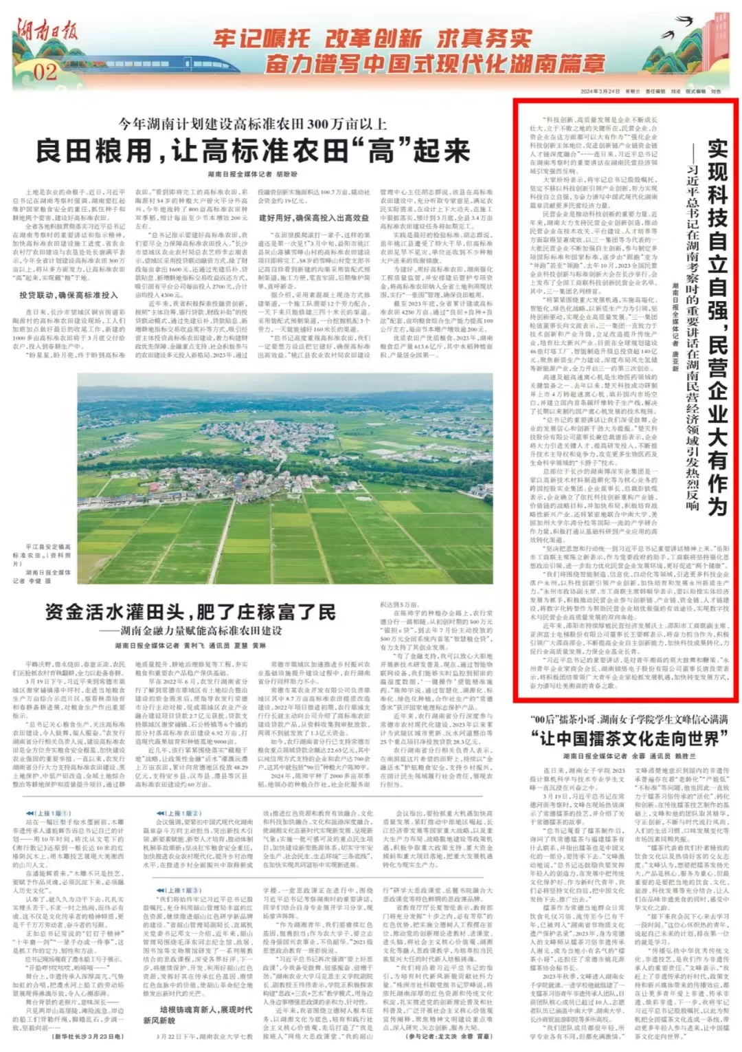 3月24日,《湖南日报》刊发《实现科技自立自强,民营企业大有作为》,深度报道习近平总书记在湖南考察时的重要讲话在湖南民营经济领域引发热烈反响,其中重点关注三一集团作为民营企业的创新先锋,加速发展新质生产力,为产业现代化转型注入新动能。