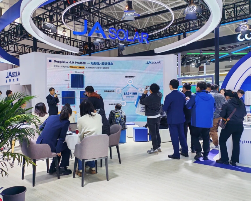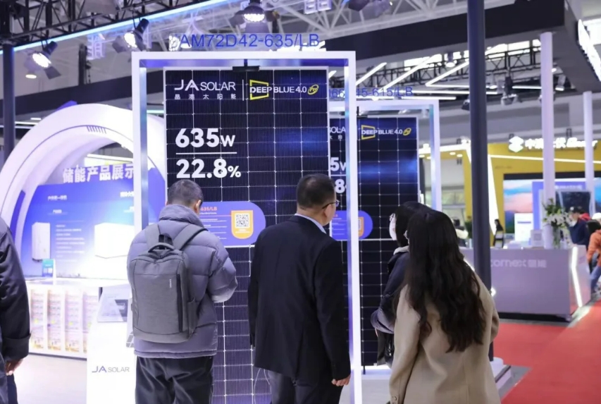 本次展会,晶澳科技展出了DeepBlue 4.0 Pro系列产品。DeepBlue 4.0 Pro系列产品采用了晶澳科技自主研发的高效n型Bycium+钝化接触电池技术,电池开路电压达到733mV,量产效率达26%。同时,DeepBlue 4.0 Pro组件还集成了SMBB技术、高密度封装技术等提质增效核心技术,72版型组件功率可达635W,组件效率达22.8%,是目前行业182系列组件中功率最高的产品。
