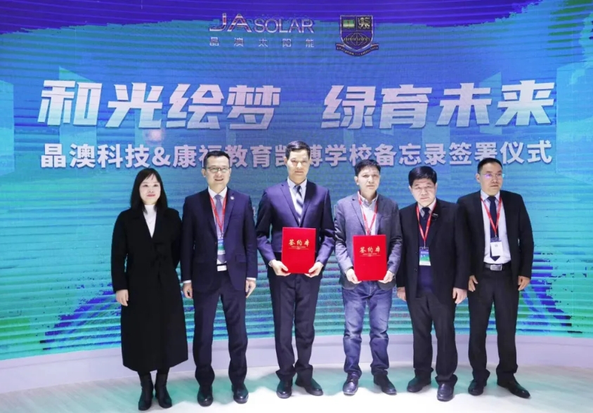 展会期间,晶澳科技与康福国际学校凯博学校签订备忘录,标志着晶澳科技产学结合战略再获新突破,将进一步推动双方深度交流与融合,为清洁能源行业的可持续发展注入新的活力。