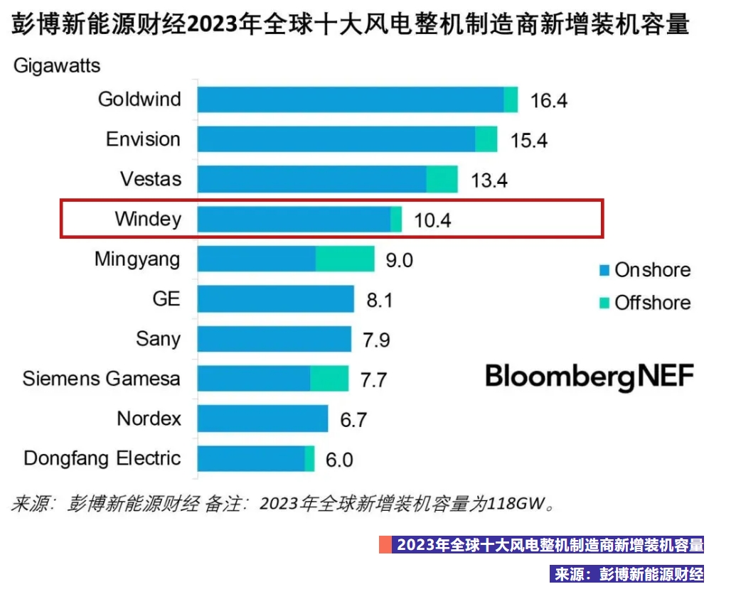 3月27日晚,彭博新能源财经发布2023年全球风电整机制造商市场份额排名。数据显示,2023年全球风电新增装机容量为118GW,相较于2022年增长36%。其中,运达股份排名跻身全国前三、全球前四,刷新历史最好成绩。