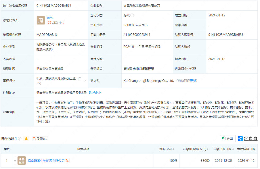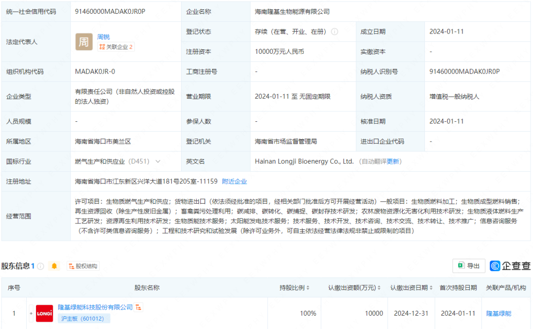 企查查信息显示,许昌隆基生物能源有限公司是海南隆基生物能源有限公司全资子公司,于2024年1月12日注册成立。海南隆基生物能源有限公司注册于2024年1月11日成立,由隆基绿能全资控股。