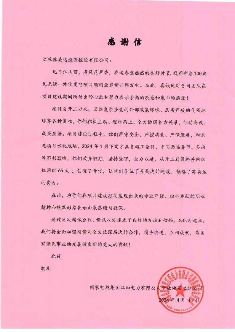 该项目是能源公司与国家电投集团江西公司的首次合作。执行过程中,能源公司充分发挥“建一项工程,树一座丰碑”的工程精神,克服南方雨季汛期、极端强对流天气等困难,严守安全、严控质量、严保进度,高效完成各项工作。其中,该项目水北地块建设工作从开工到完成仅用了65天,展现出能源公司敢打硬仗、能打胜仗的“工程铁军”风范,得到业主单位的书面点赞。