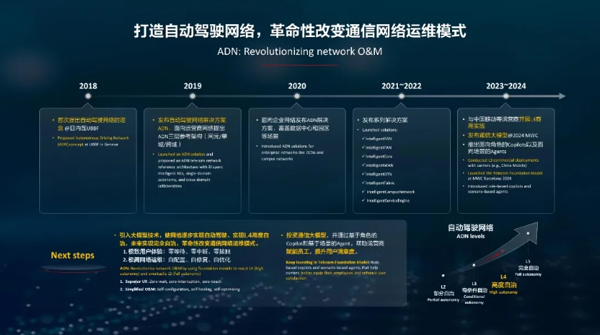 ❖ 打造自动驾驶网络,革命性改变通信网络运维模式。电信运营商网络运维是非常复杂的,因此成本也非常高。因此在2018年的日内瓦UBBF,华为参考汽车自动驾驶的分级理念提出了自动驾驶网络的概念,也就是ADN(Autonomous Driving Network)。经过这么多年和电信运营商持续的探讨、联合创新,形成了大量的ADN解决方案,到今天,ADN已经成为网络运维智能化转型的战略共识。而大模型出来以后,自动驾驶网络的目标更加具有现实意义了,运营商都希望自己的网络能够尽快实现自动驾驶、实现L4高度自治,未来实现完全自治,带来以“零等待、零中断、零接触”为标志的极致的用户体验,和以“自配置、自修复、自优化”为标志的极简的网络运维。华为将与中国及全球运营商合作打造通信大模型,并首先通过基于角色的Copilot和基于场景的Agent,帮助运营商赋能员工,提升用户满意度,让运营商尽快因大模型技术和自动驾驶网络而获益。