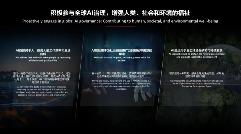我们认为AI应服务于人,提高人的工作效率和生活品质,通过AI使能行业数字化,改变行业的生产方式,成为各行业进入智能世界的核心引擎;要持续降低AI的技术门槛,让每个人、每个家庭、每个组织拥有平等获取和使用新技术的机会。同时,AI应运用于为社会创造更广泛的福祉等善意的用途,在AI的设计、开发和使用过程中,要审慎评估新技术对社会带来的长期和潜在影响,避免技术滥用。以及,AI应运用于生态环境保护和可持续发展,积极运用AI来研究、解决全球关注的问题,如联合国可持续发展目标。