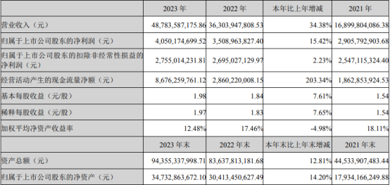 4月18日晚,亿纬锂能(300014)发布2023年年度报告。2023年,公司实现营业总收入487.84亿元,同比增长34.38%;归母净利润40.50亿元,同比增长15.42%;扣非净利润27.55亿元,同比增长2.23%。