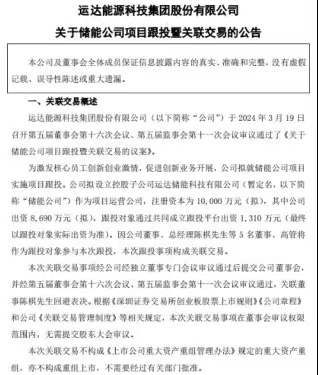 2024年3月底,风电领域的龙头企业运达股份发布公告,官宣成立控股子公司拓展储能业务,注册资本为1亿元。出资比例中,运达股份拟出资8690万元,其余的1310万元则由公司的系列骨干共同成立跟投平台来出资。