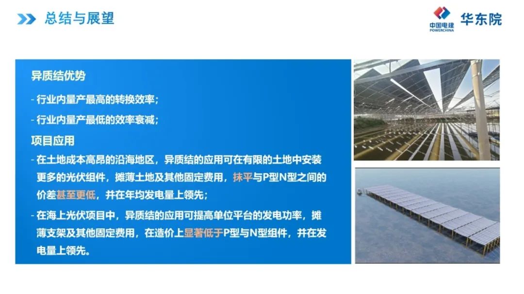 电建华东院杨翁经理从大型项目应用角度出发,认为异质结具备了行业内量产最高的转换效率和行业内量产最低的效率衰减,因此在沿海地区或者海上光伏项目中,可在有限的土地中安装更多的异质结光伏组件,不仅有效节约土地、支架等成本,而且在年均发电量上领先。展望未来,杨翁经理相信N型组件,尤其是异质结组件将成为行业内的应用首选,行业内在应用端对异质结的认可度会快速提升。