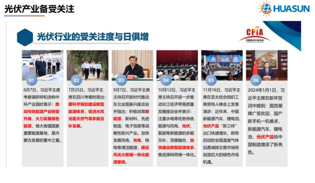 总书记对于这个是比较关注的。他非常关注光伏,新能源过去是保能源的饭碗,现在是保经济的饭碗,因为中国经济可靠的发动机不多了,以光伏为主的新能源是全球共同的话题,哪怕经济这么糟糕,我们去年大概是全球装了400吉瓦,今年保守数据,有说要超过600吉瓦,有说570吉瓦的,今年我觉得接近600GW是肯定有的量,相比去年还能增长接近50%左右。