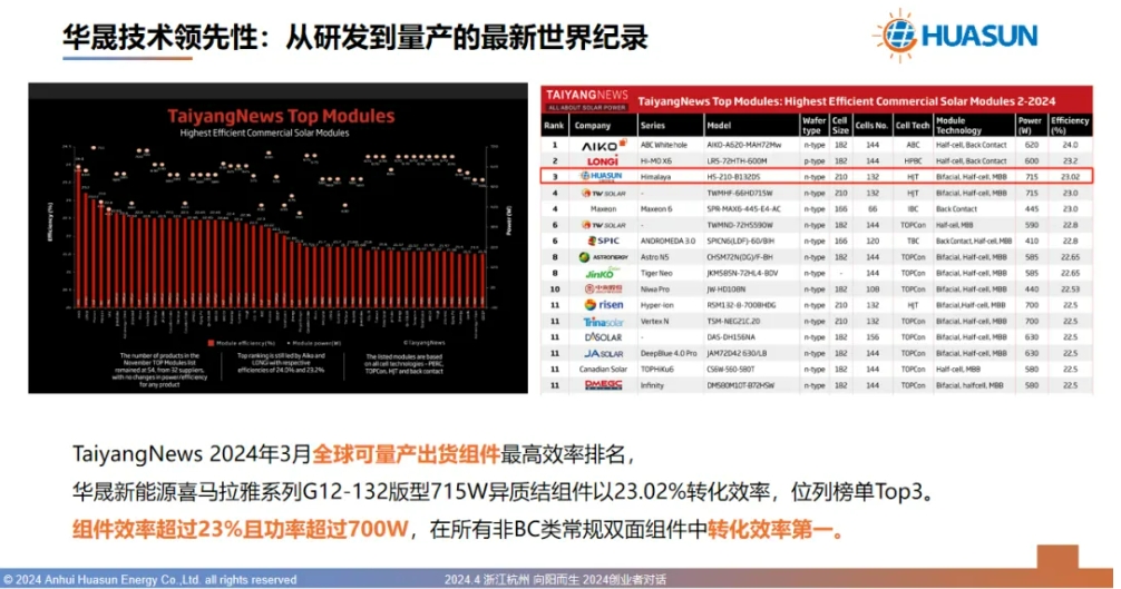 最后讲讲华晟。我们创业三年多不到四年,到今年7月份满48个月,我们在四个地方做了20个吉瓦的电池组件。我们是全球最年轻的光伏独角兽企业,2022年我们拿了全球光伏的大奖,是全球第一家能做出700W的异质结组件量产出货的厂家。特别重要的一点是去年美国的PVEL把全球30家企业的光伏组件拿来测试,我们发电量排在全球第一,我们在海外比较受欢迎。我们做得好的原因是团队比较强,大概有超过400个拥有异质结经验的,中国做过异质结的一半人才都在华晟。
