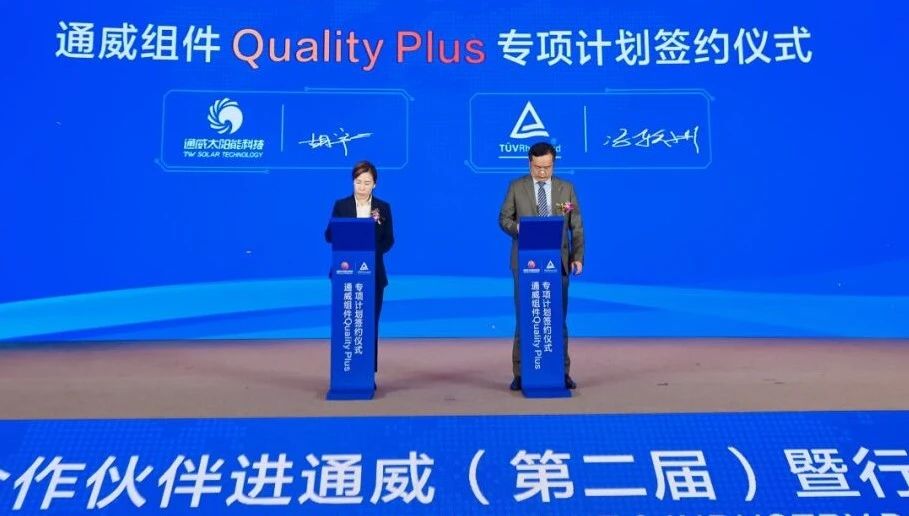 会上,通威太阳能科技与莱茵TÜV集团签订通威组件Quality Plus专项计划,并在与会嘉宾的共同见证下,通威组件Quality Plus专项计划正式启动。该专项计划,以客户为中心,以产品品质为主导,以数据为基础,以团队为推动力,致力于持续优化产品品质基因,为客户提供更多的附加值。