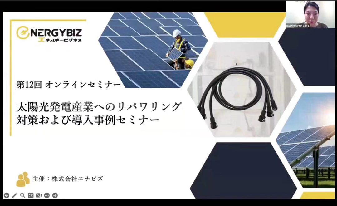 4月25日,由Enabiz Inc.(株式会社エナビズ)主办的太阳能发电产业的重新赋能对策及引进案例线上研讨会在云端启动,全球各地的企业雇主和行业专家讨论和分享了如何通过提高发电量、减低维护成本以及增加电力交易收入等对太阳能发电设施“重新赋能”。浙江润海新能源有限公司(简称“润海光能”)受邀参加此次线上会议。