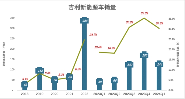 修订版没有给出新能源车占比要达到的目标,但吉利的重视程度是空前的。2022年新能源车销量达35.4万辆,占比24.7%。