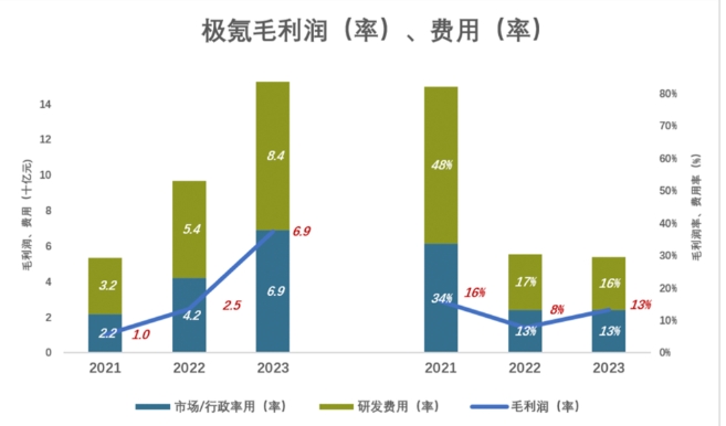 2023年,极氪毛利润68.5亿,市场/行政费用69.2亿、高于毛利润;研发费用83.7亿,费用率高达16.2%,较比亚迪高10个百分点!