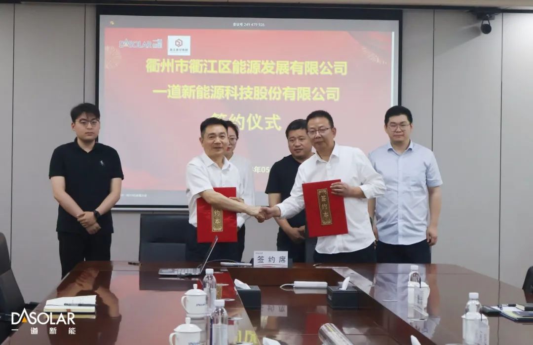 近日,一道新能源科技股份有限公司与衢州市衢江区建设投资集团能源发展有限公司签署战略合作协议,双方将充分发挥各自资源优势,秉承互利共赢原则,共同开发及推进衢江区200MW集中式农光互补地面电站项目建设。衢江区建投集团董事长郑闽超、总经济师柴剑慧,一道新能副总裁周宪彪出席签约仪式。