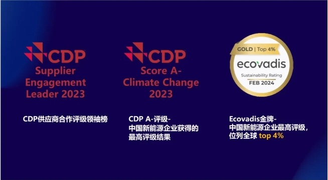 远景已于2022年实现自身的全球运营碳中和,并计划在2025年实现自身及重点供应商100%绿电使用目标;同年远景也获得了CDP A-的评分,完成从B到A的跨越,并获得供应链A级评分,进入供应链领先排行榜;还获得EcoVadis “金牌”评级,跻身全球前4%,综合得分超过了96% 以上的全球参评公司,是中国已披露的新能源企业中的最高分。