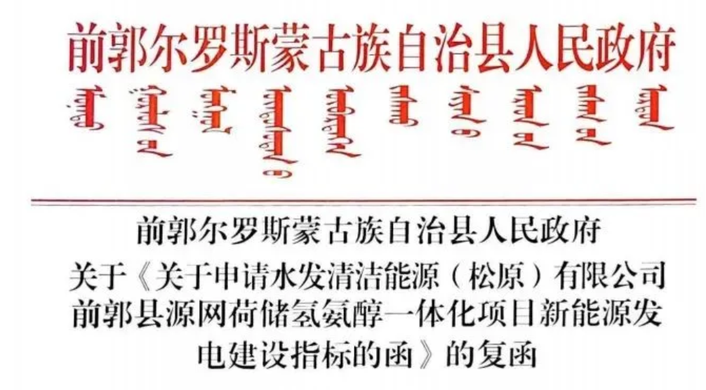 5月21日,吉林省正式公布前郭尔罗斯蒙古族自治县人民政府关于《申请水发清洁能源(松原)有限公司前郭县源网荷储氢氨醇一体化项目新能源发电建设指标函》的复函,明确支持水发清洁能源(松原)公司投资建设前郭县源网荷储氢氨醇一体化项目。