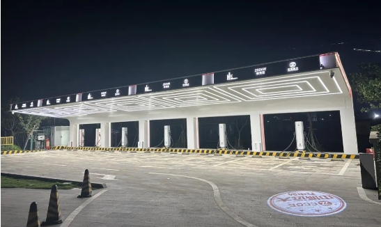 该项目采用光充一体的解决方案,超充站上方建设光伏车棚,铺设光伏组件,装机容量达30kW,预计年发电量2.76万kWh;下方建设充电车位,率先采用华为全液冷超充解决方案,部署了1套600/720kW的全液冷超充主机,配备2个600kw的液冷超充枪和8个250kw的快充枪,可同时为10辆车提供充电服务,成为“光充融合”示范工程。