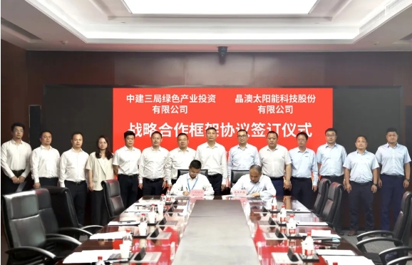 5月22日,晶澳太阳能科技股份有限公司与中建三局绿色产业投资有限公司在武汉签署战略合作框架协议。晶澳科技执行总裁杨爱青,中建三局副总经理夏元云,中建三局绿投公司党委副书记、总经理闵红平见证签约,并就进一步深化合作开展会谈交流。