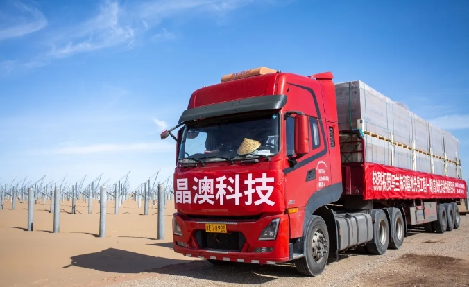 2024年5月31日,巴彦淖尔市磴口县,一辆辆满载晶澳科技n型组件的货车顺利抵达“乌兰布和沙漠东北部新能源基地先导工程100万千瓦光伏发电项目”的现场。这是该项目首批组件到场,预示着乌兰布和沙漠风光大基地的建设已经拉开帷幕,开始提速启航。