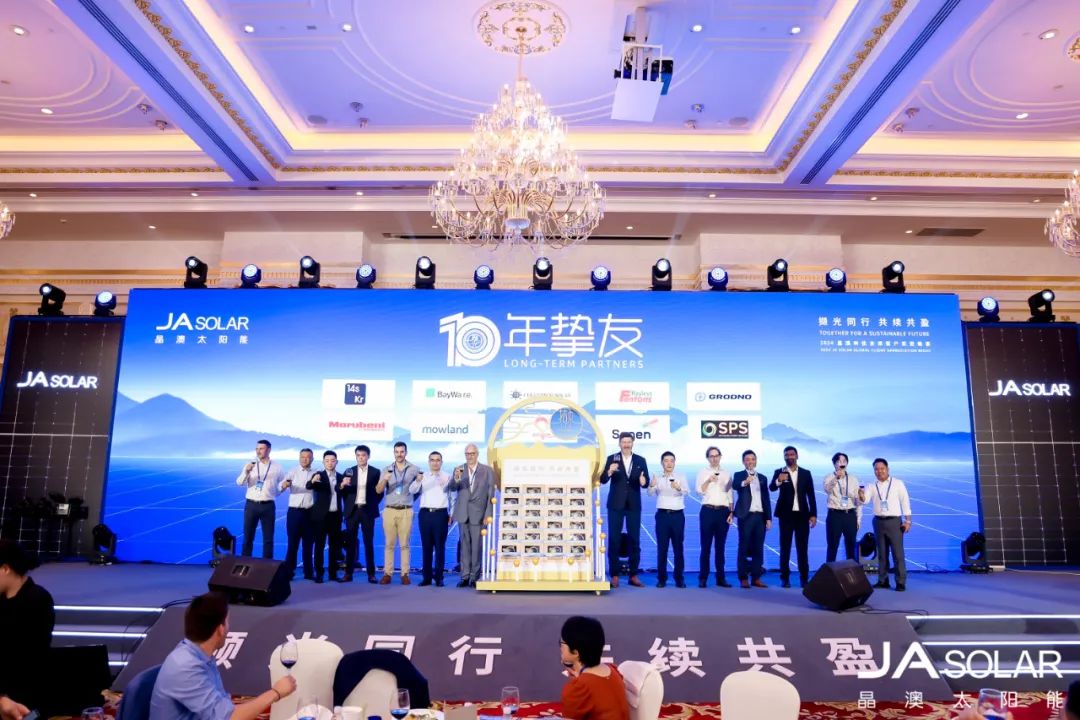 在“2024晶澳科技全球客户欢迎晚宴”现场,璀璨灯光下,热烈气氛中,诸多精彩纷呈的节目与互动环节纷至沓来。但其中最引人瞩目的,当属晶澳科技为具有十年合作历史的生态伙伴特意举办的“挚友时刻”环节。