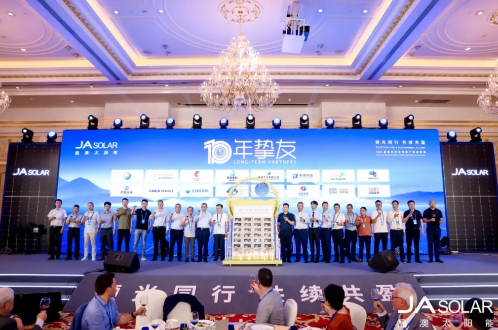 在热烈的掌声和欢呼声中,晶澳科技的十年挚友们一一走到舞台中央,并一同合影留念。这一意义非凡的时刻,不仅将定格在这个美好的夜晚,更将被永远记入晶澳科技的发展历程之中。