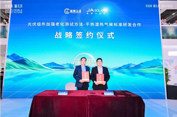 此外,在展会现场,北京鉴衡认证中心还与晶澳科技进一步签署了“光伏组件加强老化测试方法——于湿热气候标准合作研发”项目,意味着双方将继续探寻光伏n型组件的应用极限,最大程度赋能可持续未来。