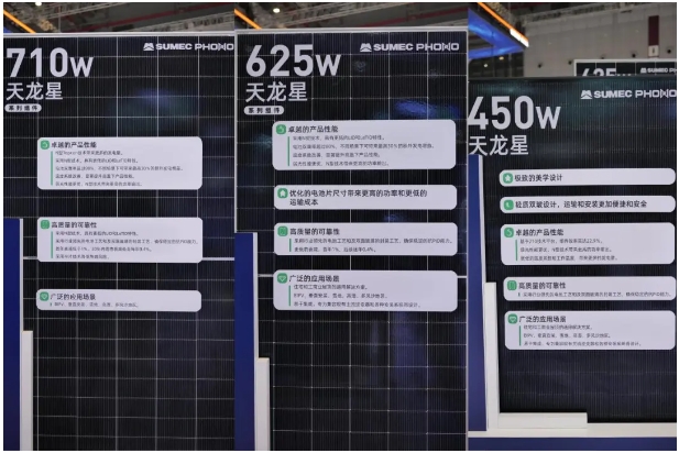 在苏美达能源的展台上,苏美达能源旗下辉伦太阳能品牌的天龙星系列组件熠熠生辉,三款明星产品惊艳亮相,覆盖小、中、大三种版型,横跨400W至700W+全功率档位,满足户用、工商业和集中式全应用场景需求。天龙星700W+组件以其高功率、高性价比的优势,为客户创造卓越价值。同时,苏美达辉伦积极推动210R技术发展,天龙星210R产品兼具高效能与最优运输成本的特点。此外,针对户用市场,特别推出了全黑设计的天龙星产品,这款全黑组件以其色彩一致、与建筑完美融合的特点,不仅提升了建筑的整体美感,更实现了清洁能源与建筑艺术的和谐统一,深受欧洲市场欢迎。