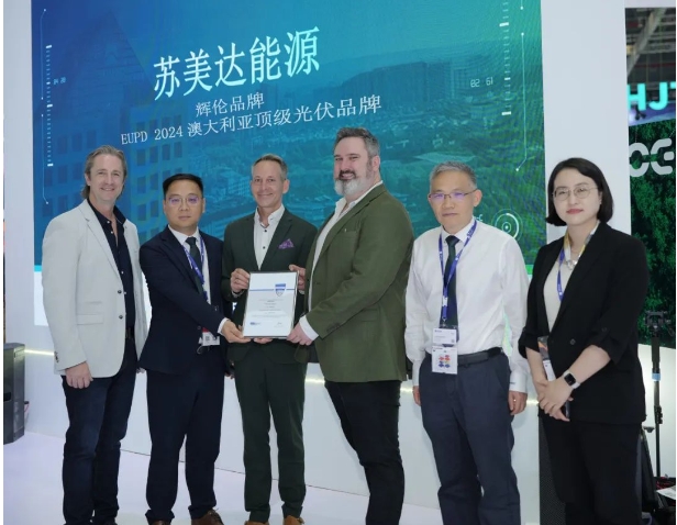 苏美达能源,作为拥有多年品牌积淀的能源央企,多年秉承“创新、可靠、可持续”的品牌理念,以卓越工艺、优质选材和严格生产流程,成为高转换效率、高可靠性光伏产品和服务的代名词。展会当天,苏美达辉伦品牌荣获EUPD Research“澳大利亚顶级光伏品牌”奖项,连续七年获此殊荣,彰显了苏美达能源在光伏行业的卓越实力和可持续发展能力。授证仪式上,EUPD Research的Daniel Fuchs与苏美达能源董事长郭宏伟,副总经理赵兴国共同出席,见证了这一荣耀时刻。