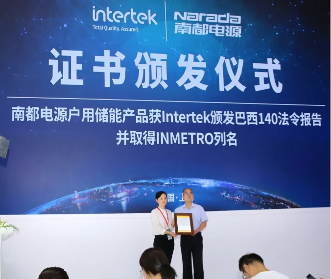在展台发布区,全球领先的质量和安全服务机构INTERTEK受邀,为南都NESR系列户用储能产品颁发INMETRO证书。证书的获得为该产品顺利进入巴西市场提供了强有力的安全保障。