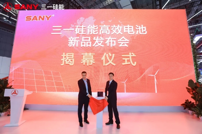 下午,三一硅能新款高效电池正式发布。三一硅能电池公司总经理郑旭然、电池公司副总经理陈嘉为新品揭幕。