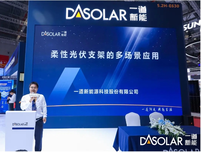 展会现场,一道新能应用技术部总经理何春涛博士在一道新能全场景解决方案的演讲中深刻剖析了生态、城市和海上三大场景下的光伏发展先决条件,并通过实际案例对比和多种实验结果论证了一道新能全场景光伏系统应用解决方案的创新优势。一道新能将自主研发的柔性光伏支架与高效N型组件、轻质组件等产品相结合,更好地助力于土地综合复用,推动了农光、林光、渔光及光伏治沙等综合性光伏+项目的应用普及,实现经济效益、生态效益与社会效益的多方共赢。值得一提的是,在水面光伏领域,一道新能已自主研发出高性能类铝复合浮体材料,为海上漂浮式光伏平价上网提供了可能。
