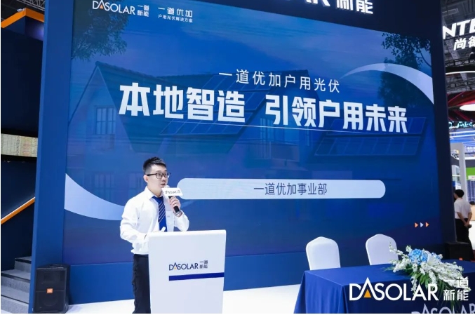 十四五以来,在“双碳”目标和乡村振兴战略的双轮驱动下,户用光伏产业发展迅猛,成为光伏行业发展的一大强劲动力。为进一步提升本地客户服务体验,去年,一道新能重磅推出旗下户用分布式子品牌“一道优加”,致力于为客户提供最快捷、最无忧的“本地化一站式”清洁能源服务。展会现场,一道优加渠道推广部经理程晗越先生在“本地智造 引领户用未来”主题演讲中分享了一道新能户用光伏电站建设、运维管理、技术创新等方面的宝贵经验。程晗越先生表示,一道优加以深耕“本地造 多发电”为核心战略,依托一道新能十多个生产基地构建了辐射全国的产业布局,为客户提供“次日达”高时效物流送货服务及1小时专业技术响应服务。此外,一道优加针对户用场景下的斜顶屋、平顶屋、院落、阳光棚、曲面屋顶等五大场景推出定制化解决方案,通过权威设计、优质产品及差异化解决方案,让客户坐享更高绿色收益。