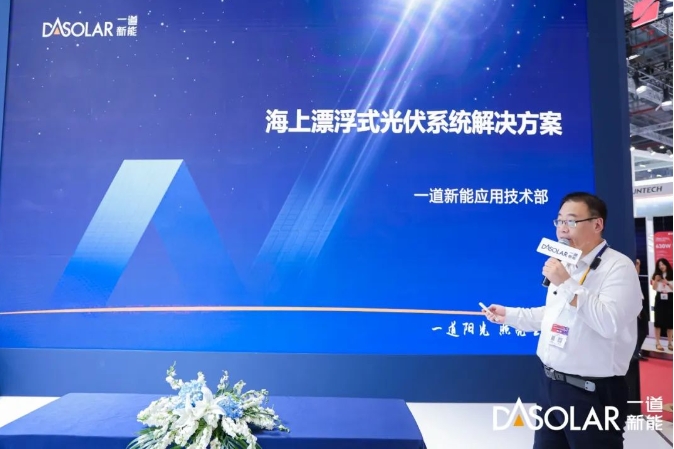 一道新能应用技术部总经理何春涛博士在水面光伏专题演讲中分享了一道新能在海上漂浮式光伏领域的最新研究进展和解决方案。何春涛博士指出,依据风机发展的经验来看,光伏行业的发展也将经历陆地到海上,固定到漂浮,浅海到深海的过程。一道新能抢抓机遇,早在2019年就开始了海上光伏领域的布局,在产品开发、技术研发及应用实证测试等方面走在前列。