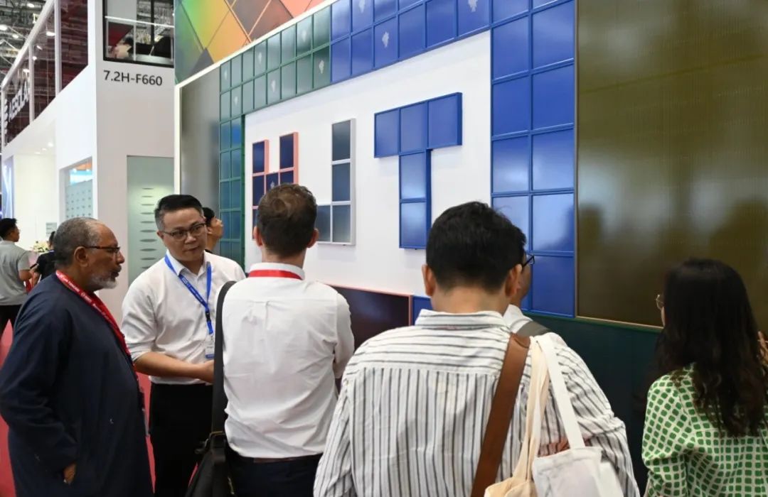 因为阳光,所以绚烂。网红背景墙基于华晟此次展出的新品彩色组件,由不同尺寸和不同色彩的HJT组件特别设计而成,吸引了众多光伏人现场拍照,已成为7号馆网红打卡点。