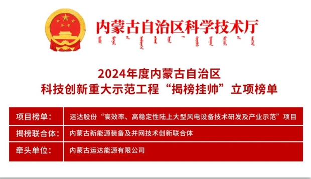 近日,2024年度内蒙古自治区科技创新重大示范工程“揭榜挂帅”立项榜单尘埃落定。经过各大顶尖团队的激烈角逐,运达股份“高效率、高稳定性陆上大型风电设备技术研发及产业示范”项目脱颖而出,以其前瞻谋划和卓越设计成为此次评选中唯一揭榜的“风电帅旗”。