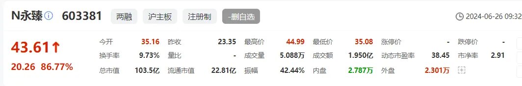 6月26 日,永臻科技股份有限公司(证券简称:永臻股份;证券代码:603381)在上交所主板成功上市。公司发行价为23.35元/股,发行市盈率为15.06倍。截至发稿,永臻股份股价报43.61元/股,涨幅高达86.77%,总市值为103.5亿元。
